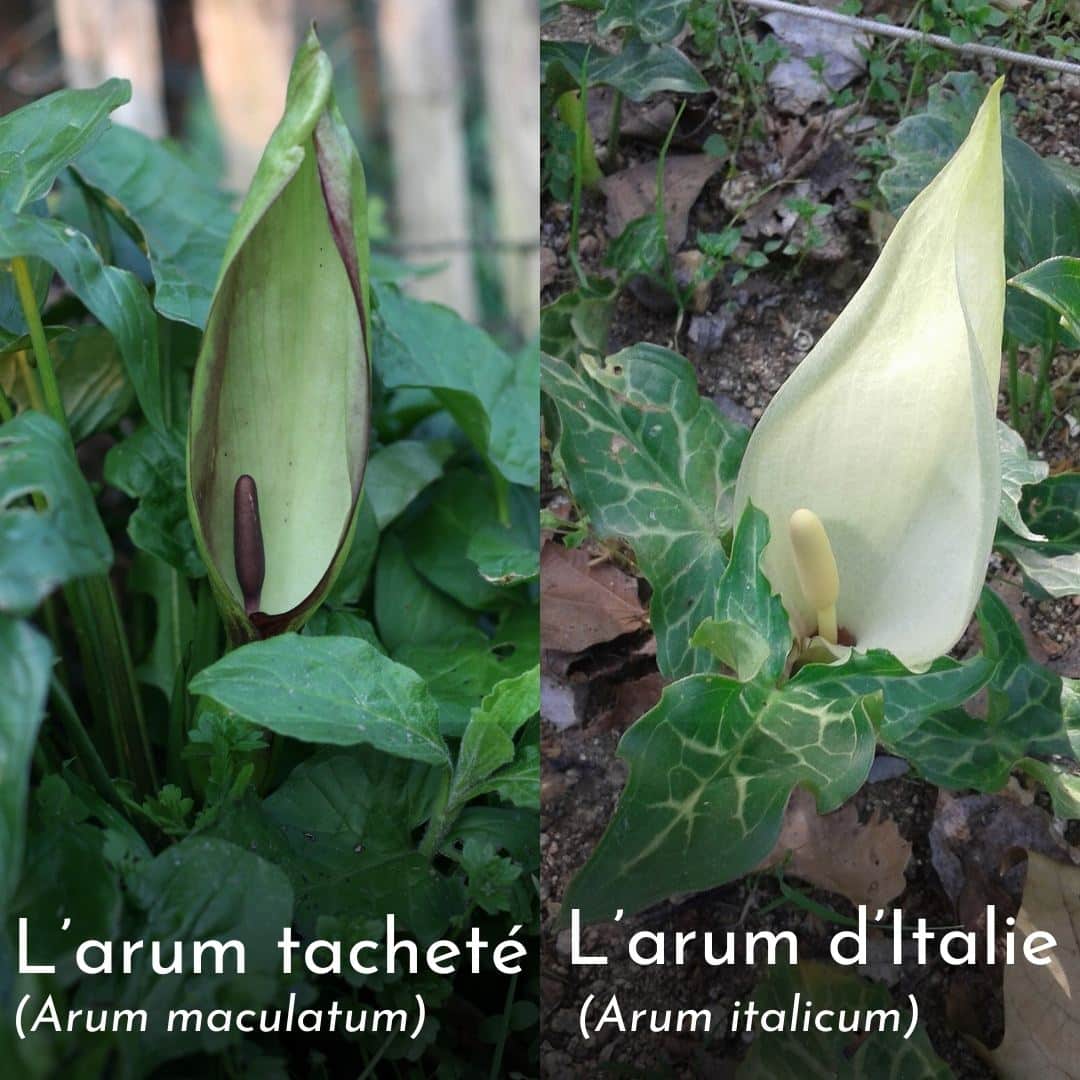 Ces deux arums ont un point commun : ils sont toxiques, bien que non mortels. Ce sont eux, qui parmi les plantes sauvages, causent le plus d’intoxications en France³, notamment car leurs feuilles ressemblent à plusieurs de nos plantes comestibles : l’oseille, l’épinard⁴, ou encore l’ail des ours. De plus, ces deux arums poussent en mélange dans les mêmes milieux comme les bords de chemin et les sous bois frais¹, ce qui invite à redoubler de vigilance lors de la cueillette.