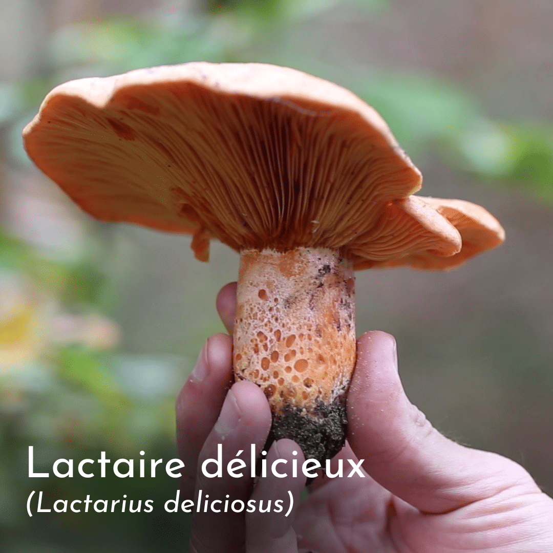 Le lactaire délicieux pousse près des pins et se distingue par son chapeau orangé à cercles concentriques, son pied creusé de petites fossettes et son lait orange vif qui s’écoule lorsqu’on entaille les lames. Son pied se casse comme de la craie, sans fibres longues.
