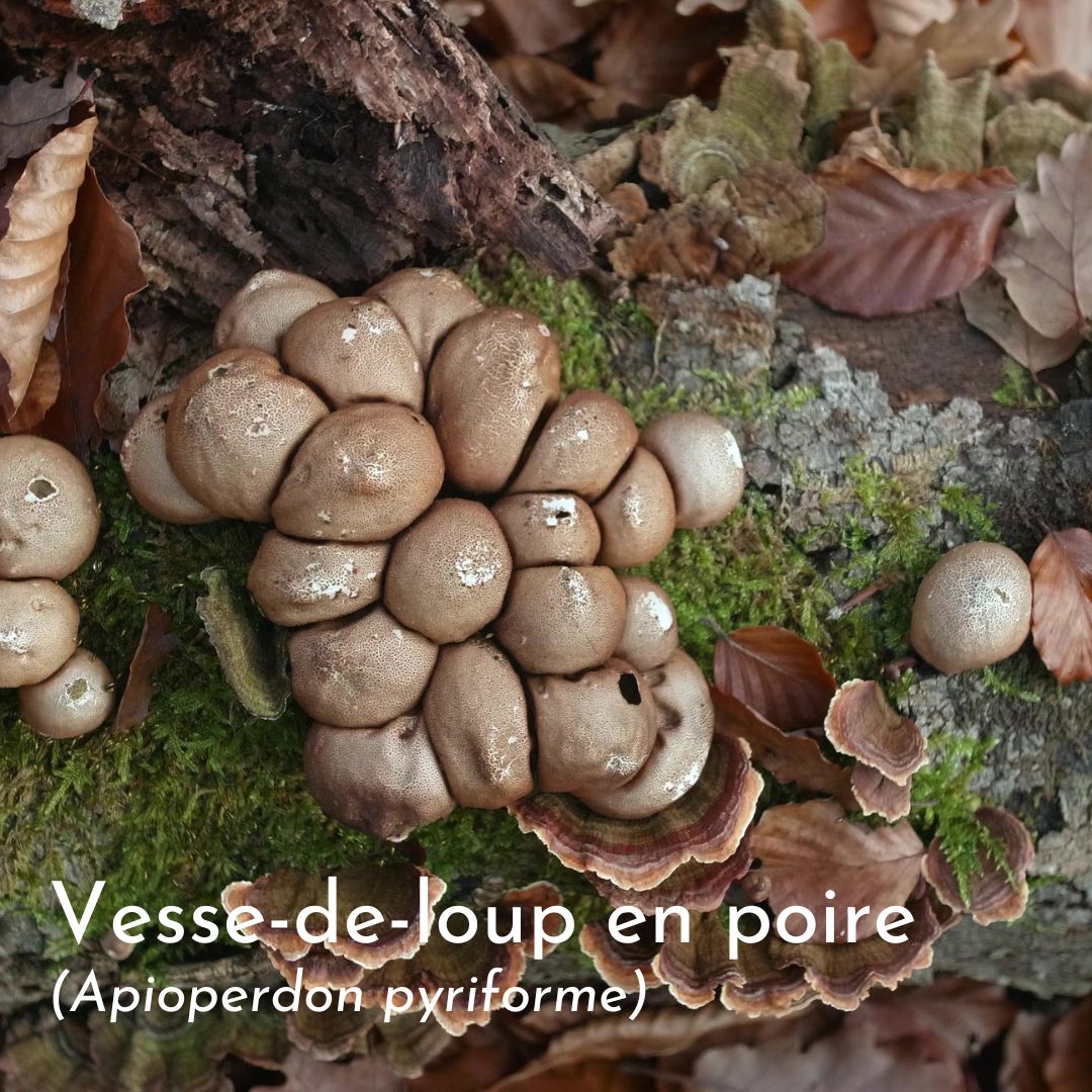 La vesse-de-loup en poire (Apioperdon pyriforme) est l’une des plus courantes. Elles poussent souvent en touffe sur du bois mort, et quand elles apparaissent, c’est donc rarement seules ! Elles sont comestibles uniquement quand elles sont jeunes, avec une chair blanche et ferme. En vieillissant, l’intérieur devient brun : c’est le signe que les spores se sont développées, et qu’elles ne sont plus bonnes à manger.